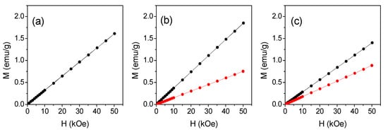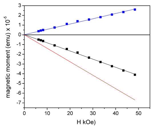 MP, MDE2, and MDB were analyzed as powders, and curves of magnetization (M) vs. magnetic field (H) were measured at T = 300 K (Figure 2).
