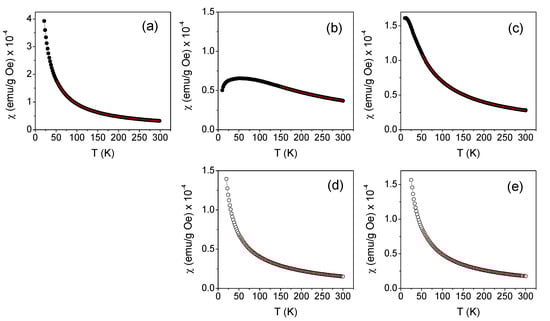 Curves of mass susceptibility (χ) as a function of temperature (T) measured on the freshly (a–c) or aged (d,e) prepared MP (a), MDE2 (b,d), and MDB (c,e) compounds, in Happl = 10 kOe. The red lines are the fitting curves to the Curie–Weiss law.