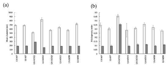 Dimensional parameters of the produced anionic liposomes obtained before (light gray) and after extrusion (dark gray). Mean diameters are expressed as Z-average (a) and dispersity index values (b).