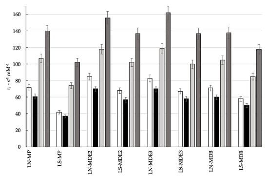 The produced liposomal samples were subjected to a basic relaxometric investigation. Figure 8 shows the longitudinal (r1; white, black) and transverse (r2; light gray, dark gray) relaxivity values normalized to a 1 mM concentration of Mn(II). Measurements were conducted at 25 °C in two magnetic fields: 0.47 T (white and light gray) and 1.4 T (black and dark gray).