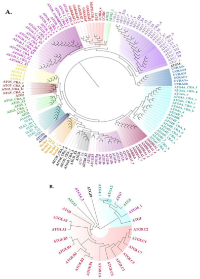 Phylogenetic tree illustrating evolutionary conservation across ATG proteins; different color keys indicate different types of ATG proteins. (A) Phylogenetic tree of Homo sapiens (B) Phylogenetic tree of Leishmania major.