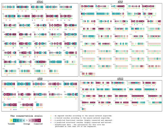 Sequential Conservation analysis of ATG proteins using ConSurf web server A. ATG12, B. ATG8, C. ATG4.1, D. ATG5.