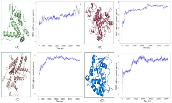 Stability and sustainability of proteins were performed using Molecular Dynamics Simulation by DESMOND 3.2 (D.E. Shaw Research, New York, NY, USA) [47]. All the proteins were simulated for 300 ns chemical time. Appropriate charges were added to neutralize ions in the system. For equilibration, TIP3P solvation system and NPT ensemble was used. The RMSD plot indicates the stability of proteins, quality and event analysis of protein was also performed [47].