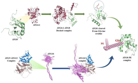3-Dimensional structures of ATG proteins from Homo sapiens and Leishmania major were modeled using Homology modeling by using Modeller9.23 [35] and Ab initio modeling by Robetta server [Available online: https://robetta.bakerlab.org/ (accessed on 2 March 2021)] [36]. The structures were visualized and evaluated using PyMOL v1.7.4.5 (originally developed by Delano Scientific LLC and now owned by Schrodinger, Inc) [37] and RAMPAGE. For the interactions’ studies, the HADDOCK web server [Available online: https://wenmr.science.uu.nl/haddock2.4 (accessed on 20 March 2021)] [38] is used, which highlights the protein-protein interacting residues. HADDOCK is a favored docking tool that allows creating data-driven docking, by utilization of known experimental data. Active residues from experimentally proven research were entered into HADDOCK for site specific docking [38]. It constructs the topology of the molecules to be docked automatically. ATG4-ATG8 complex and ATG12-ATG5 complex were docked by employing HADDOCK. The docking methodology is then subdivided into three steps: rigid-body energy minimization, semi-flexible refinement in torsion angle space, and explicit solvent refinement. The HADDOCK score will be assigned by a weighted combination of van der Waals, electrostatic, desolvation, and restraint violation energies plus buried surface area to each docking complex. ClusPro web server [Available online: https://cluspro.org (accessed on 1 April 2021)] [39] is also used for ATG16 complex interaction studies. Since interacting residues for ATG16 in relation to ATG5 and ATG12 are not reported in the literature, we have used the ClusPro online server for docking, which require protein in PDB format and active residues are not compulsory. It provides results in the form of clusters based on the low energy and RMSD score. PDBePisa is used to look for residues of amino acids on interfaces that are involved in interactions. The results were presented in the form of clusters, which were then shortlisted using PDB sum’s cluster analysis [40,41].