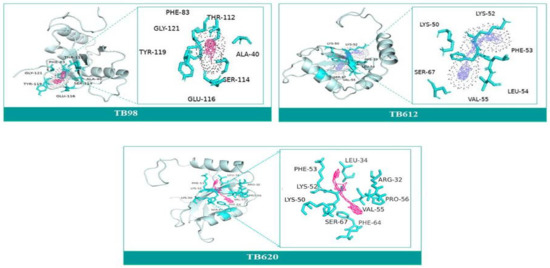 The goal of molecular docking is to predict ligand-binding sites on receptor surfaces as well as the binding affinities associated with them. Shortlisted derivatives of Thiabendazole were docked blindly with the predicted structure of ATG8 and virtually screened on the basis of molecular docking. Each docking had nine docked conformations assigned to it and the conformation of derivatives with the lowest binding energy was chosen for molecular dynamics simulations. Molecular docking had screened library to top 10 hits and their respective binding energies, interacting residues are mentioned in Supplementary Table S5, and docked conformations are represented in Supplementary Figure S1. To further investigate the interplay of amino acids and derivatives, LigPlot v.2.2 was used. Dominant three derivatives among ten were concluded on the basis of molecular dynamics simulation studies and related details are enlisted in Table 3. Root Mean Square Deviation (RMSD) plot delineates stability of interacting Thiabendazole derivatives with ATG8. Docked conformations and RMSD plots and interacting residues graphs of the top three hits are represented in Figure 8 and Figure 9, respectively.