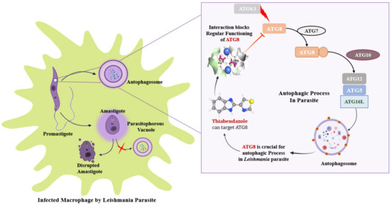 ATG8 being a critical protein for parasite development and infectivity, is also regarded as an autophagic marker and as a result being investigated as a potential therapeutic target. Data suggests, it can be concluded that the interaction of the ATG16 complex is required for the activation of ATG8 and its proper recruitment to the autophagosome. Mutational studies have emphasized essential amino acid residues of ATG8 for its functionality. While, as previously stated, Thiabendazole has the potential to be a viable pharmacological target against Leishmaniasis [18,19]. Thus, this study hypothesized that Thiabendazole could act as a drug by targeting ATG8 as a novel therapeutic target for Leishmaniasis by targeting the parasite’s autophagy process. Graphical representation of targeting ATG8 against Leishmaniasis by using Thiabendazole lead as a drug molecule is depicted in Figure 7.