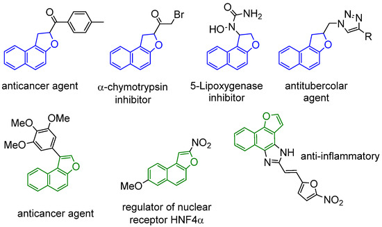 Although in nature naphtho[1,2-b]furans and 2,3-dihydronaphtho[1,2-b]furans, such as those in Figure 1, are more common, in synthetic pharmacologically-active compounds, naphtho- and 1,2-dihydronaphtho[2,1-b]furan derivatives are more diffuse and exhibit a broad spectrum of different biological properties, such as anticancer [5,6]; anti-inflammatories [7] or antitubercular agents [8]; regulators of nuclear receptor HNF4-α [9]; and inhibitors of α-chymotrypsin, lipoxygenase, and C17,20 lyase [10,11,12] (Figure 2).