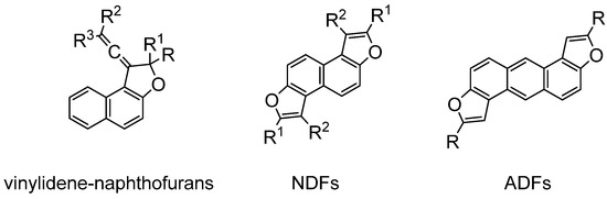 Furthermore, the importance of these scaffolds is also due to the optical properties of some particular compounds, such as, for instance, vinylidene-naphthofurans, which show photochromism at room temperature in the solid state when adsorbed on silica gel or exposed to UV or sunlight [13], or NDFs (naphthodifurans) and ADFs (anthradifurans), which have been studied for their applications as hole-transporting materials and photosensitizers [14] (Figure 3).