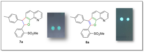 It is interesting to note that both dihydrofuroquinoline 7a and furoquinoline 8a show fluorescent properties under UV light, at a different wavelength compared to the naphthofuran derivative 6a (Figure 6). We intend to develop the study of fluorescence for derivatives 7 and 8 in the future.
