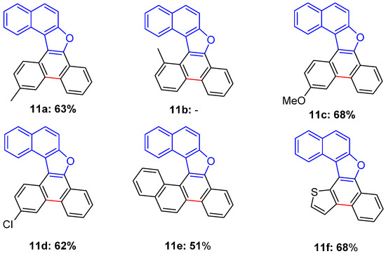 The photoinduced process was then extended to the whole 6b–f series, obtaining in each case (but for 6b) good yields in the aromatized products 11c–f (Figure 7), without isolation of the alternative polycycles 11′c–f or of the corresponding cyclohexadiene intermediates 10 or 10′.