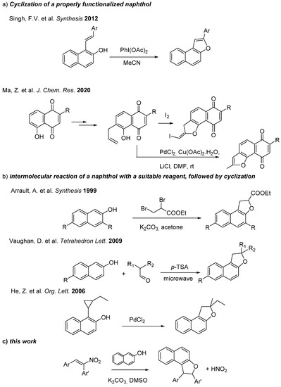 Due to their wide range of applications, many synthetic methods for the preparation of naphtho- and dihydronaphthofuran derivatives have been reported (Scheme 1)—the most common involving either the cyclization of a properly functionalized naphthol [15,16,17] or the two-step intermolecular reaction of a naphthol with a suitable reagent, followed by cyclization to give the final heterocyclic system. More often, basic conditions are employed to improve the reactivity of naphthol as double nucleophile, as, for instance, in the classical approach of the annulation of 2-naphthol with dihalo compounds [18]. However, the use of p-TSA [19,20] or of metal catalysis [21,22,23,24,25,26,27,28] has also been pursued.
