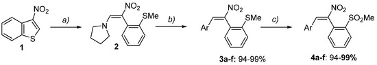 Within this context, we considered of particular interest the hypothesizable outcome of the double nucleophilic attack of β-naphthol on 4a (Ar = p-tol). This particular substrate actually is not exactly a nitrobutadiene, but rather a nitrostilbene, deriving from the initial ring-opening of 3-nitrobenzo[b]thiophene with pyrrolidine [42] (Scheme 2). From the ring-opening product 2, sulfane 3a (Ar = p-tol) originates by reaction with p-tolyl magnesium bromide; the following oxidation at sulfur with MCPBA produces sulfone 4a. Therefore, the nitrobutadienes 3a and 4a retain the reactivity of the nitrovinyl moiety, gaining at the same time stability, thanks to the inclusion of the conjugated double bond within a benzene ring.