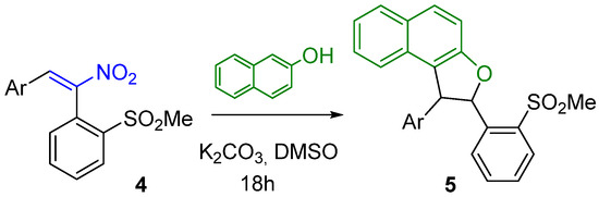 However, since most of the protocols reported in the literature [29,30] suffer from some limitations, such as, for instance, the substrate scope and the possibility to obtain differently functionalized products, the development of more versatile methods is still a topic of interest. In this context, nitrostyrenes have been considered as useful annulation reagents in the reaction with naphthols, because of their ability to react as double electrophiles with the bidentate naphthol enolate, generated in situ under basic conditions. Particular functionalization of the nitro-compound, as, for example, in Morita-Baylis-Hillman [31], together with different reaction conditions, could lead to naphthodihydrofuran or to naphthofuran derivatives, in this case, occasionally with the help of an increase of temperature.
