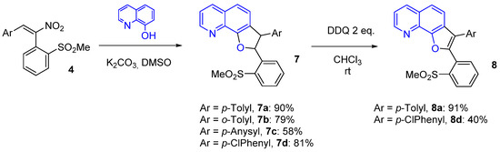 The relevant dihydrofuran 6 (0.12 mmol) was dissolved in chloroform (3.0 mL) and DDQ (0.24 mmol, 54.5 mg) was added. The reaction was maintained under magnetic stirring at room temperature, until completion (24 h, monitored by TLC). Then, an aqueous saturated NaHCO3 solution (8 mL) was added, and the resulting mixture was extracted with CHCl3 (3 × 15 mL). The combined organic layers were dried over anhydrous Na2SO4, filtered, and concentrated in vacuo. The reaction mixture was purified by column chromatography (petroleum ether/ethyl acetate 1:1) to afford the desired products 8a–d.