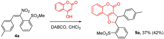 In order to obtain a different polyheterocyclic system, we turned our attention to another phenolic nucleophile, e.g., 4-hydroxycoumarin, whose behaviour was studied with the model nitrostilbene 4a. Under the usual reaction conditions (K2CO3 in DMSO) the process proved to be very slow, and the desired product was not present in the final reaction mixture, probably due to the prevalence of alternative pathways, such as, for instance, the hydrolysis of the coumarin ring. Searching for a suitable system, we performed the reaction in the presence of an organic base (DABCO) in a less polar solvent (CHCl3), observing in this case the dihydro-4H-furochromenone derivative 9a in a complex reaction mixture, containing also unreacted starting material (13%); the reaction is still under investigation in order to optimize the conditions and effectively improve the yield (Scheme 6).
