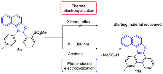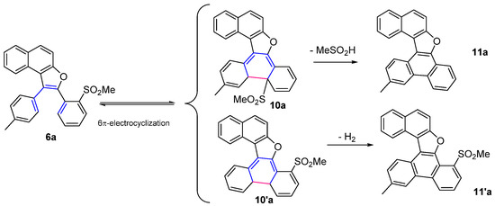 As a further evolution for naphthofurans 6a–f and furoquinolines 8a,d we devised an electrocyclization process in order to increase the complexity of our polyheterocycles systems. To undergo the pericyclic reaction, the 6π-conjugated system includes three “aromatic” double bonds, e.g., that of the furan ring, and those of the 3-aryl and the 2-(2-methylsulfonyl)phenyl substituents. Due to the presence of two non-equivalent ortho positions in the sulfonylated ring, two different electrocyclization products could in principle be expected (10a and 10′a) (Scheme 7), from which two aromatized systems (11a and 11′a) could in turn originate, via methanesulfinic acid elimination or rather by dehydrogenation, respectively. Both processes seemed to be of potential interest, so we proceeded to find the adequate conditions.