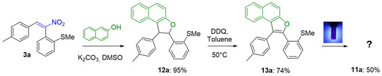 In order to test the role of the methylsulfonyl group of 6 in the electrocyclization, we prepared the corresponding sulfane derivative 13a by applying to 3a the procedure of Scheme 3 and aromatizing the resulting 12a. Interestingly enough, when we applied the photoinduced process to 13a, the product isolated was identical to that isolated from 6a, e.g., the full aromatic polycycle 11a (Scheme 9).