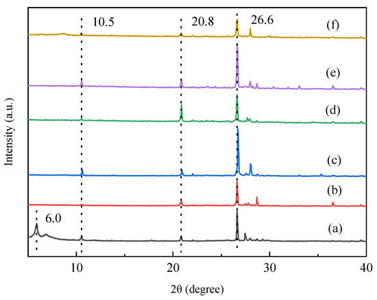 XRD patterns of Vrm (a) Vrm-HS15 (b) Vrm-HS35 (c) Vrm-HC35 (d) Vrm-HP35 (e) Vrm-3rd (f).