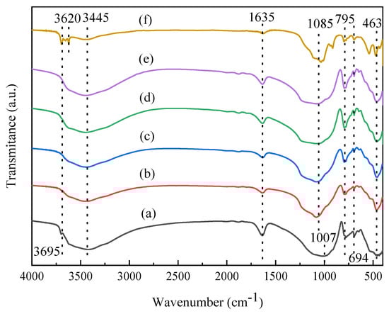 Figure 2 presents FTIR spectra of raw and acid-activated vermiculite catalysts. From Figure 2, the band observed at 3445 cm−1 is due to the adsorbed water on Vrm. The stretching vibration of -OH group appears at 3695 cm−1, which is coordinated to the octahedral layer [35,36]. The band at 1635 cm−1 is attributed to the bending vibration of water. The peak at 1007 cm−1 corresponds to the stretching vibration of Si-O-Si and Si-O-Al and the peak at 463 cm−1 is the Si-O-Mg bending vibration. Peaks at 795 cm−1 and 694 cm−1 are ascribed to the symmetric stretching vibration peak of amorphous silica (Si-O-Si) or Si-O-Al [24,25]. For the acid-activated Vrm, the shoulder peak at 3695 cm−1 and the peak at 463 cm−1 both became stronger. It might be that the layer structure of Vrm was destroyed and the octahedral layer was exposed. Moreover, the peak at 1007 cm−1 was shifted to 1085 cm−1, which should be attributed to the leaching of Al ions in the tetrahedral layer [17]. For the regenerated sample, there existed two strong bands at 3695 and 3620 cm−1, which are ascribed to -OH groups coordinated to the octahedral layer and Si-OH groups. It also presented that the octahedral layer was exposed and there had more surface -OH groups after regeneration. Therefore, from the FTIR results, it also showed that the layered structure of Vrm was destroyed after acid treatment and there appeared more -OH groups on the surface of Vrm.