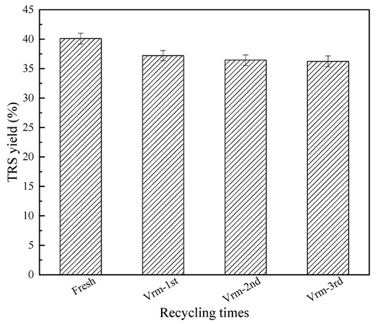 It is well known that reducing sugars can be further converted into other products such as levulinic acid, formic acid, or coke. Therefore, the optimal reaction conditions on the hydrolysis of cellulose was further studied. According to our previous work, the parameters were selected and the results are shown in Figure 5. From Figure 5, the optimal reaction time and reaction temperature was 3.5 h and 478 K. This might mean that by-products were easily formed over 3.5 h, and cellulose or reducing sugars were gradually carbonized above 478 K [2,6,9]. As the catalyst/cellulose mass ratio was up to 0.18, and a water/cellulose mass ratio was 16, the highest TRS yield was obtained. It is well known that water is a key factor in the hydrolysis of cellulose, and the hydrogen protons produced by water promote the hydrolysis reaction [7,9]. It should be that there was just the correct concentration of hydrogen protons for the conversion of cellulose in the reaction system under the optimal catalyst/cellulose mass ratio and water/cellulose mass ratio. The concentration of hydrogen protons might be too high in a short time, which would cause the reducing sugars produced to be converted into other by-products or coke. The TRS yield gradually decreased. Therefore, the highest TRS yield of 40.1% could be obtained on the acid-activated vermiculite under the reaction temperature of 478 K, reaction time of 3.5 h, mass ratio of catalyst to cellulose of 0.18 and mass ratio of water to cellulose of 16. The reusability of the recycled catalyst is shown in Figure 6. The TRS yield of each cycle was similar. After three-time reuse, the TRS yield decreased from 40.1% to 36.2%, demonstrating that the acid-treated Vrm was the stable catalyst for the efficient depolymerization of cellulose.