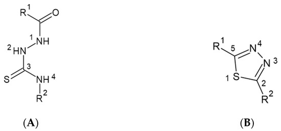 The general structure of thiosemicarbazide (A) and 1,3,4-thiadiazole (B) derivatives.