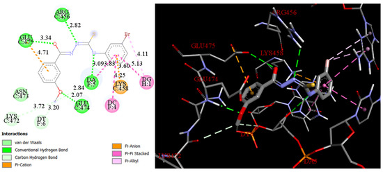 One of the most active compounds SA14 forms two hydrogen bonds between the sulfur atom and Gly459 (2.71 Å) and DG (3.28 Å). 3-Methoxyphenyl and 2-bromophenyl cores make the number of lipophilic interactions (Pi-alkyl, Pi-Pi Stacked, and Pi-Pi T-shaped) with the nucleosides. Arg122 binds to Br by a halogen bond with the length 2.61 Å. Summary interaction energy increases owing to the carbon-hydrogen bond and Pi-donor hydrogen bond.