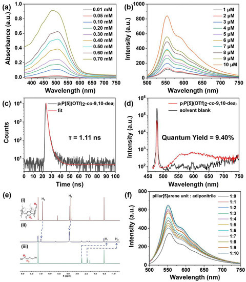 - Cui, W.; Tang, H.; Xu, L.X.; Wang, L.Y.; Meier, H.; Cao, D.R. Pillar[5] arene-Diketopyrrolopyrrole Fluorescent Copolymer: A Promising Recognition and Adsorption Material for Adiponitrile by Selective Formation of a Conjugated Polypseudorotaxane. Macromol. Rapid Commun. 2017, 38, 1700161. [Google Scholar] [CrossRef] [PubMed]