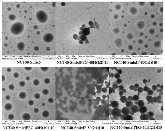 The internal droplet morphology of 100-fold diluted NCT-ME formulations that were examined using transmission electron microscopy (TEM) presented small droplet sizes. The droplets appeared to be of a spherical form (Figure 1). The average size determined from the scale bar was around 200 nm, showing a nanosized range similar to those reported by dynamic light scattering (DLS). The largest droplet sizes were observed in NCT50-Smix0 without surfactant, which was around 500 nm.
