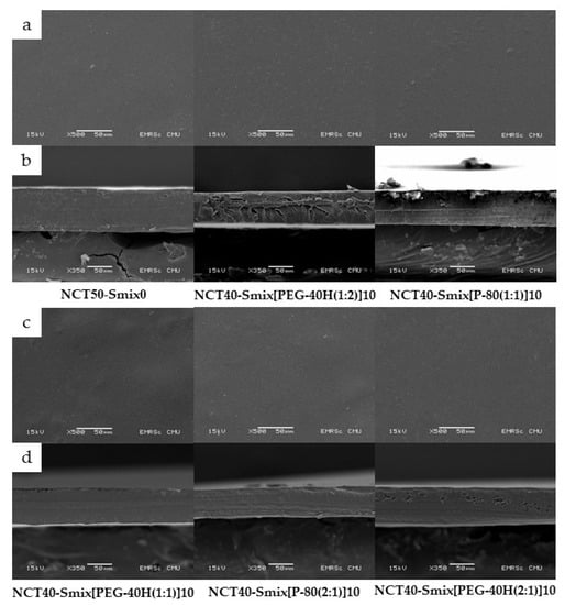 The result of thickness, weight, disintegration time, and normalized disintegration time of NCT-ME fast-dissolving films is shown in Table 2. The thickness of the NCT-ME film measured with a micrometer equaled the thickness determined by scanning electron microscopy (SEM), as presented in Figure 2. Between all NCT-ME and NCT50-Smix0 films, there was no difference in thickness or weight. The normalized disintegration time is the disintegration time of each film divided by the ratio between its thickness, and the minimum values of an average thickness of all formulations. This value is calculated to reduce film variation. However, there was a difference in disintegration time and normalized disintegration time between NCT40-Smix[PEG-40H(2:1)]10 films and the other films (p < 0.05). It was noticed that the NCT40-Smix[PEG-40H(2:1)]10 film had lower normalized tensile strength and percent elongation at breaking than the NCT50-Smix0 film and some NCT-ME fast-dissolving films, as shown in Table 2, which led to the shortest disintegration time. The disintegration time and normalized disintegration time of the NCT-ME fast-dissolving films were both less than 32 s, which is an acceptable disintegration time for a fast-dissolving film, which is defined as a film that disintegrates or dissolves in less than 60 s after being placed in the mouth without drinking water or chewing [21].