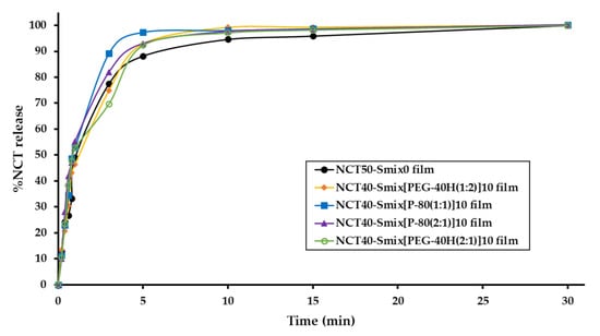 The dissolution studies were carried out under the sink condition. A medium volume of at least three times higher than that required to generate a saturated solution of the drug substance is referred to as sink conditions. The accumulated concentration of sample in the dissolution medium (φ) is less than one-third of its saturation solubility [24]. On the other hand, NCT is soluble in water at temperatures below 60.8 °C (1 × 106 g/L); consequently, the calculated φ value is 0.0001 and was less than one-third of its saturation solubility [25,26]. As a result, this in vitro release experiment was classified as a sink condition. As illustrated in Figure 3, the in vitro drug release profile of NCT-ME fast-dissolving films is displayed as a plot, representing a correlation between NCT release percentage and time. The t80% of NCT release was observed between 3 and 30 min in films. The average release of NCT at the end of the experiment (30 min) was 100.0 ± 0.1%. The NCT40-Smix[P-80(1:1)]10 film had the fastest dissolution rate than other films during 3–10 min.