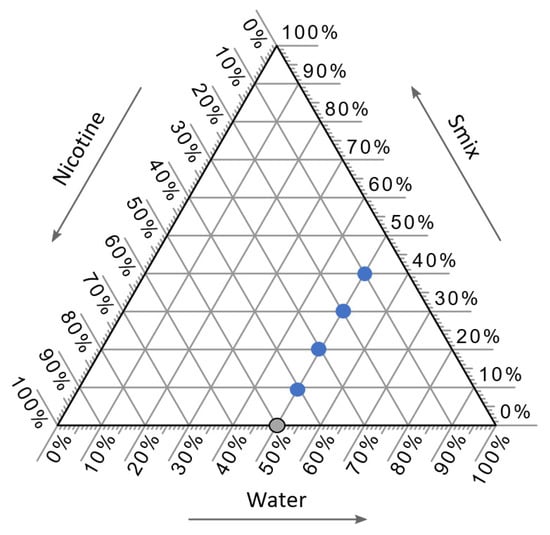 Selected components from pseudo-ternary phase diagrams of the NCT-ME, which were composed of NCT, Smix, and water. The blue circles represent the NCT-ME formulations, whereas a gray circle represents the NCT without ME.