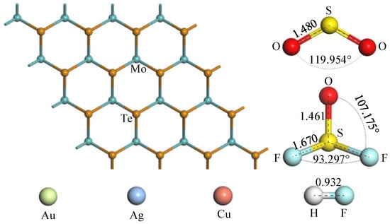 The introduction of transition metal atom modification on the surface of two-dimensional layered materials effectively improves surface activity and gas-sensing performance [24,25]. In particular, nano-noble metals, such as Au, Ag, and Cu, may show better surface performance [26]. This is because transition metal atom modification increase the chemical activity and electron mobility of pristine materials, opening up a new perspective on exploring high-performance gas sensor [27]. Based on density functional theory (DFT) calculations, transition metals (Au, Ag, and Cu) were selected as modifying atoms on the MoTe2 surface in this study. Then, SO2, SOF2, and HF gas molecules are adsorbed on three transition metals (Au, Ag, and Cu) modified MoTe2 monolayer, abbreviated as TM-MoTe2. The surface modification and gas-sensing mechanism have been studied by analyzing the geometric structures and electronic properties.
