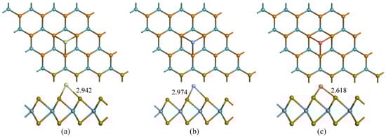 First, the geometric structure and electronic properties of the TM-MoTe2 monolayer were studied. Liu et al. achieved geometric relaxation of TM modification on the pristine MoTe2 monolayer through four possible positions [34]. After complete optimization, it can be seen that the TM atoms prefer to be trapped at the TH site (located above the center of the MoTe2 hexagonal ring). Therefore, this paper has three different TM atoms in the TH position for geometric optimization. It is worth noting that the three TM atoms form three bonds with three adjacent Te atoms after optimization, resulting in a certain degree of structural distortion in each system. However, in the optimized configuration, the lengths of the three TM-Te bonds are equal. It can be seen from Figure 2 that the average length of the TM-Mo bond in the TM-MoTe2 model is 2.942 Å, 2.974 Å, and 2.618 Å, respectively.