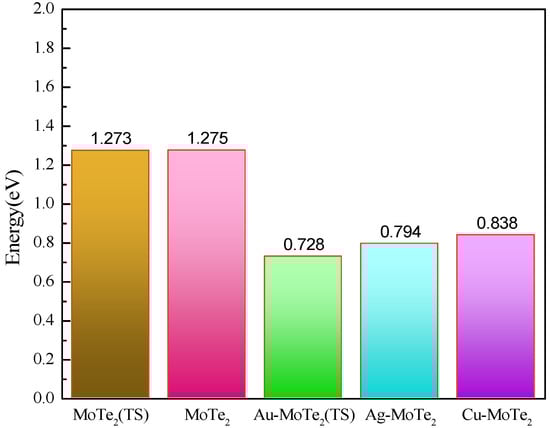 Table 1 shows that the bonding strengths of TM atoms on MoTe2, which increase in the order of Ag < Au < Cu, and the binding energies are 1.61 eV, 1.47 eV, and 1.13 eV, respectively. It shows that Au, Ag, and Cu of the same group can interact with the adjacent undercoordinated Mo atoms. The electron transfer from the TM atoms to the MoTe2 monolayer is −0.238 e, 0.007 e, and −0.104 e, respectively, which is crucial to the chemical activity and sensitivity of the TM modified MoTe2 monolayer. As shown in Figure 3, the band gaps of the MoTe2 single layer under TS optimization and Grimme optimization are 1.273 eV and 1.275 eV, respectively, which is not much different overall. All of the bandgaps of the TM-MoTe2 monolayer reduce, especially the bandgap of Au-MoTe2 reduces to 0.728 eV. The band gaps of Ag-MoTe2 and Cu-MoTe2 are also respectively reduced to 0.794 eV and 0.838 eV, which is very important for the performance of the activated material.