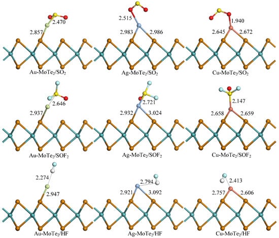 It can be seen from Figure 4 that the structure of the TM-MoTe2 monolayer has undergone significant deformation after the adsorption of SO2, SOF2, and HF gas molecules. In particular, the Au atom undergoes a significant movement from the initial modification position, the position above the center of the MoTe2 hexagonal ring to a position partial to the top of the Te atom, and two of the original three Au-Te bonds are broken. The length of the remained Au-Te bond changes to 2.857 Å, 2.937 Å, and 2.947 Å when SO2, SOF2, and HF gases adsorb on the Au-MoTe2 monolayer, respectively. On the other hand, the Ag and Cu modified MoTe2 monolayer have not undergone significant geometric deformation during the adsorption of SO2, SOF2, and HF gases, though the Ag-Te bond and Cu-Te bond are elongated to some extent. It can be determined that the Ag-MoTe2 adsorption system is similar to the Cu-MoTe2 adsorption system. The O atoms in the SO2 gas molecule and the S atoms in the SOF2 gas molecule are stably captured by the Ag atom and Cu atom by forming corresponding chemical bonds: Ag-O (2.515 Å), Ag-S (2.721 Å), Cu-O (1.940 Å), and Cu-S (2.147 Å).