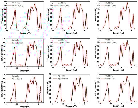 Figure 5 shows the TDOS distribution of TM-MoTe2 monolayers before and after SO2, SOF2, and HF gas adsorption. It can be seen that the TDOS distribution of the Au-MoTe2 monolayer shifts to the right as a whole after the adsorption of SO2, SOF2, and HF gases, proving that the modification of Au atoms improves the chemical activity and conductivity of the adsorption system. In addition, due to the activated state of the adsorbed SOF2 gas molecule, the TDOS distribution of the SOF2 adsorbed TM-MoTe2 system showed a continuous new peak between −10 eV and −5 eV. Moreover, the TDOS distribution of the SOF2 gas adsorption system fluctuates the most in all distributions due to a certain amount of charge transfer during the adsorption process. On the right side of the Fermi level, the TDOS distribution decreases after SO2 gas adsorption on the Ag-MoTe2 monolayer and Cu-MoTe2 monolayer, indicating that the filled electrons reduce, and a strong chemical effect occurs during the adsorption process. The TDOS distribution of the HF adsorbed Au-MoTe2 system shifts slightly to the right, but the TDOS distribution of the other two HF gas adsorption systems nearly does not change.