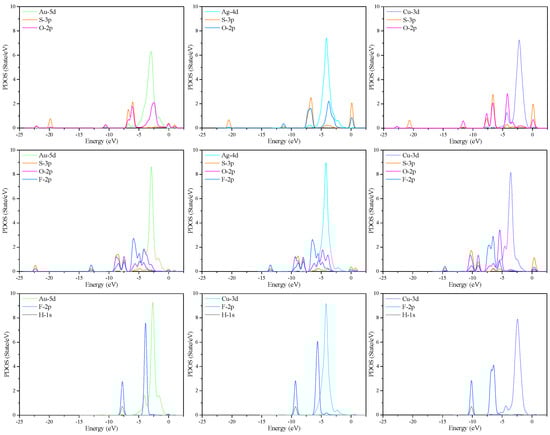 PDOS analysis was performed to understand the electronic behavior of TM-MoTe2 monolayer when adsorbing SO2, SOF2, and HF gases, as shown in Figure 6. It can be found that the 5d, 4d and 3d orbits of Au, Ag, and Cu atoms have a significant influence on their respective TDOS distributions due to their mental activities. It can be seen from the PDOS distribution of each adsorption system that the d orbits of TM atoms highly hybridize with the p orbits of S atoms or O atoms of the adsorbed SO2 gas molecules and SOF2 gas molecules. It confirms the stable formation of TM-S or TM-O bonds in the TM-MoTe2 adsorption system. In the TDOS distribution of all TM-MoTe2/HF adsorption systems, a slight fluctuation between −12.5 eV and −7.5 eV appears as a new peak derived from the 2p and 1s orbits of HF gas molecule. These orbital interactions indicate that SO2, SOF2, and HF gases have an ideal adsorption effect on the TM-MoTe2 monolayer, which leads to the redistribution of electrons on the substrate and a change of conductivity to a large extent.
