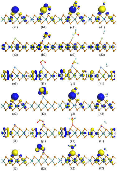HOMO and LUMO distribution of TM-MoTe2 monolayer before and after gas adsorption. (a1) Au-MoTe2-HOMO, (a2) Au-MoTe2-LUMO, (b1) Au-MoTe2/SO2-HOMO, (b2) Au-MoTe2/SO2-LUMO, (c1) Au-MoTe2/SOF2-HOMO, (c2) Au-MoTe2/SOF2-LUMO, (d1) Au-MoTe2/HF-HOMO, (d2) Au-MoTe2/HF-LUMO, (e1) Ag-MoTe2-HOMO, (e2) Ag-MoTe2-LUMO, (f1) Ag-MoTe2/SO2-HOMO, (f2) Ag-MoTe2/SO2-LUMO, (g1) Ag-MoTe2/SOF2-HOMO, (g2) Ag-MoTe2/SOF2-LUMO, (h1) Ag-MoTe2/HF-HOMO, (h2) Ag-MoTe2/HF-LUMO, (i1) Cu-MoTe2-HOMO, (i2) Cu-MoTe2-LUMO, (j1) Cu-MoTe2/SO2-HOMO, (j2) Cu-MoTe2/SO2-LUMO, (k1) Cu-MoTe2/SOF2-HOMO, (k2) Cu-MoTe2/SOF2-LUMO, (l1) Cu-MoTe2/HF-HOMO, (l2) Cu-MoTe2/HF-LUMO.