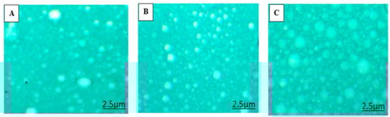 Microscopic image of formulated (A) simple nanoemulsions (SNE), (B) chitosan-decorated nanoemulsions (CNE) and (C) multiple nanoemulsions (MNE).