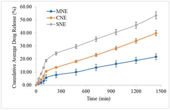 Release profiles of formulated nanoemulsions. Data were expressed as mean ± SD, n = 3, (ANOVA; p < 0.05).