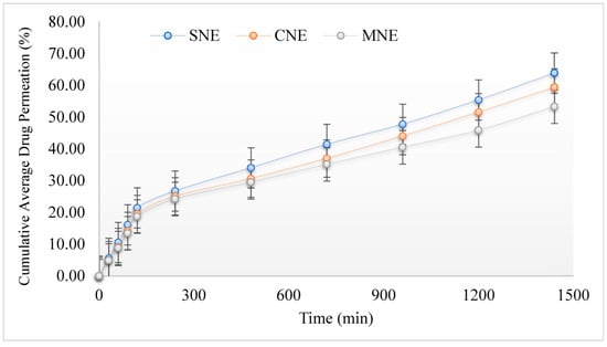 Permeation profiles of formulated nanoemulsions. Data were expressed as mean ± SD, n = 3.