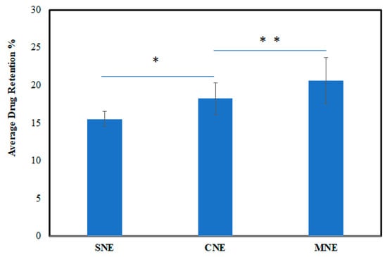 Drug retention profiles of formulated nanoemulsions. Data were expressed as mean ± SD, n = 3, (ANOVA; p < 0.05). (Note: * p < 0.05; ** p < 0.01).