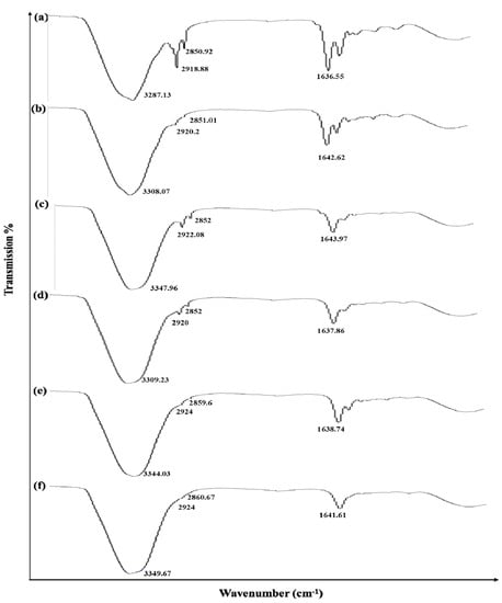 The effect of formulations on the skin was investigated using ATR-FTIR technique. The characteristic peaks of untreated skin appeared at 3237.13 cm−1, 2918.28 cm−1, 2850.92 cm−1 and 1636.55 cm−1. The absorption bands between 2800 and 3200 cm−1 matched to the alkane, aromatic hydrocarbon and amine groups. The first band was assigned to normal polymeric OH stretch. The wavenumber observed at 2918.18 and 2850.92 cm−1 may be assigned to C=H, while the 1636.55 cm−1 corresponds to the alkenyl C=C stretch [36].