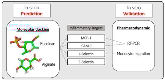 This study aimed to understand the interaction between fucoidan and alginate with the potential inflammatory biomarkers (L-selectin, E-selectin, MCP-1, and ICAM-1, respectively) that are vital in monocyte migration. Firstly, the PPIs were predicted, followed by docking, to illustrate protein–ligand interactions. Finally, the best prediction was validated using experimental methods. Figure 1 summarizes our study approach.