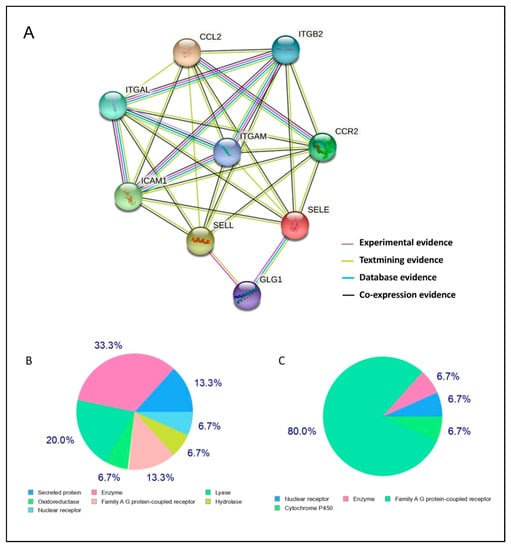 Prediction of biomolecular interactions. (A): STRING protein–protein interaction (PPI). Nodes in the network represent proteins, and different types of interaction evidence are indicated by interconnecting colored lines (co-occurrence: blue; purple; experimental: purple; text-mining: yellow; database: light blue; co-expression: black). (B,C): Swiss Target Prediction of the top 15 target categories for marine bioactive compounds: fucoidan and alginate, respectively.