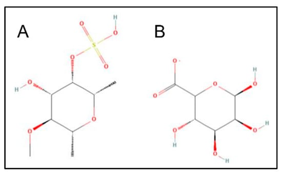 The ligand-based target prediction of classified targets fucoidan and alginate molecules by SwissTargetPrediction tool (Figure 2B,C) shows seven and four classes of human proteins, respectively. Alginate most likely interacts with G-protein coupled receptors (GPCRs) as (80%), whereas fucoidan can trigger GPCRs and secreted proteins at a similar rate of 13.13%. Physicochemical properties have great significance from the perspective of the medicinal chemistry of the drug development process. The SwissADME analysis for fucoidan and alginate monomer illustrates that both are hydrophilic (MLog p = −1.49 and −2.89, respectively). They have same number of hydrogen bond acceptors and a different number of hydrogen donors and rotatable bonds (Table 1). The 2D chemical structure of both the dietary ligands is shown in Figure 3.