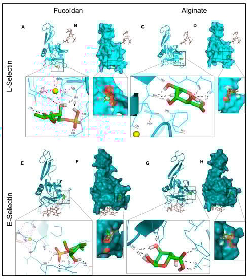 Molecular docking of L-and E-selectins with fucoidan and alginate. (A,C,E,G): 3D structures of proteins bound with N-linked glycan moieties (brown) and zoomed ligand-binding pocket. Black and purple dotted lines, respectively, describe the H-bonds and Ca2+ (yellow ball) coordination bonds. (B,D,F,H): molecular surface representation, and the red patches on the surface represent electrostatics of the binding cavity.