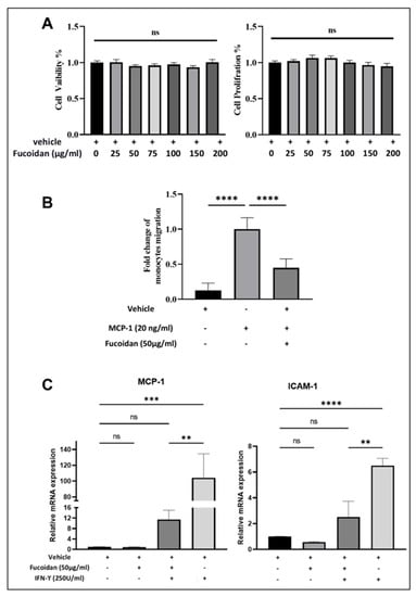 Biological activity of fucoidan on THP-1 cells. (A): Percentages of cell viability and proliferation on THP-1 macrophages subjected to various concentrations of fucoidan exposed for 24 h. (B): THP-1 monocyte migration assessed using a transwell chamber after 3 h stimulation with or without MCP-1 in the presence or absence of vehicle or fucoidan (50 µg/mL). (C): mRNA expression level of MCP-1 and ICAM-1 evaluated in THP-1 macrophages post treatment with fucoidan (50 µg/mL), vehicle, or alone for 24 h. Then cells were induced with or without IFN-γ for 3 h. Data were presented as mean ±SEM of triplicate three/two independent experiments (n = 9 for (A,B) and n = 6 for (C) and the p-values were non-significant (ns), ** p < 0.001, *** p < 0.0005 and **** p < 0.0001.