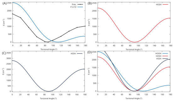 Potential energy scan of the torsional motion. (A) HOOH calculated at the F12-TZ level of theory (blue) and a previous theoretical study using HF/STO (black), (B) HOSH calculated at the F12-TZ level of theory, (C) HSSH at the F12-TZ level of theory, (D) comparison of HOOH, HOSH, and HSSH.