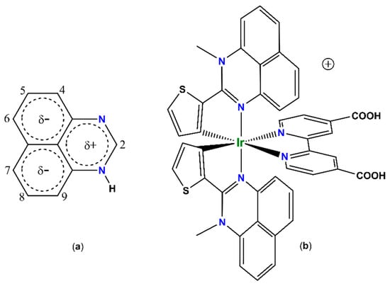 (a) Carbon atom numbering and distribution of the electron density in 1-H-perimidine. (b) Targeted structure of a cationic cyclometalated iridium(III) complex containing two electron-donor 2-arylperimidine ligands and electron-withdrawing 4,4′-dicarboxy-2,2′-bipyridine.